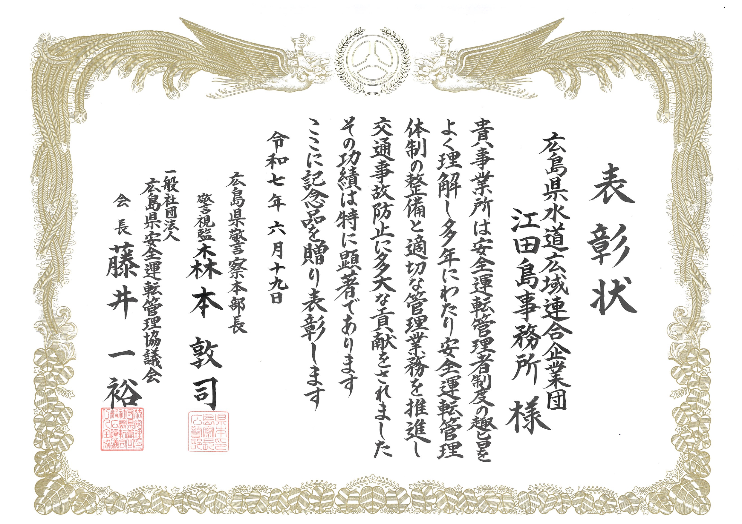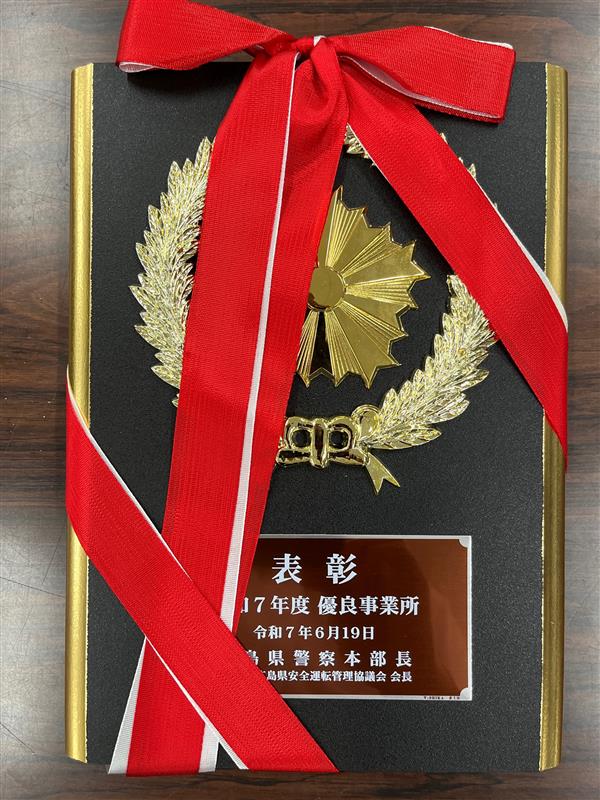 令和7年6月19日、広島ガーデンパレス(広島市東区)で行われた交通安全功労者等表彰式において、江田島事務所が安全運転管理者制度の優良事業所として表彰されました。